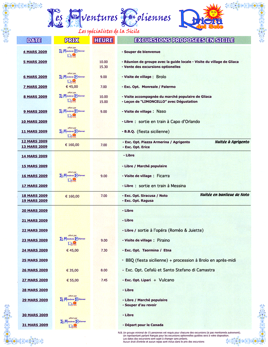 Le libellé du texte ci-dessus a été modifié comparativement à la version qui nous a été remise à notre arrivée. Des modifications de dates et d'activités ont ainsi été faites pour tenir compte de la température parfois moins propice pour nos sorties.